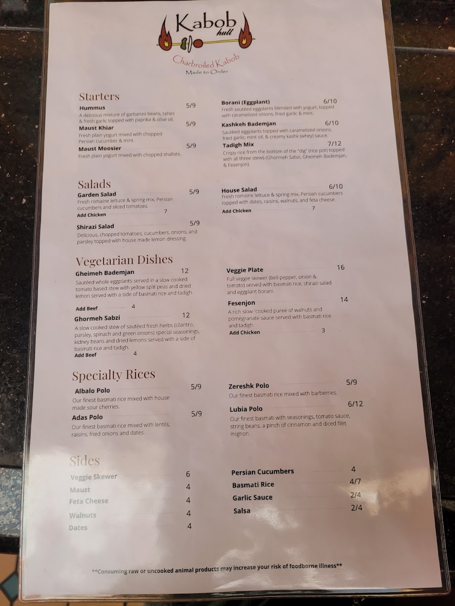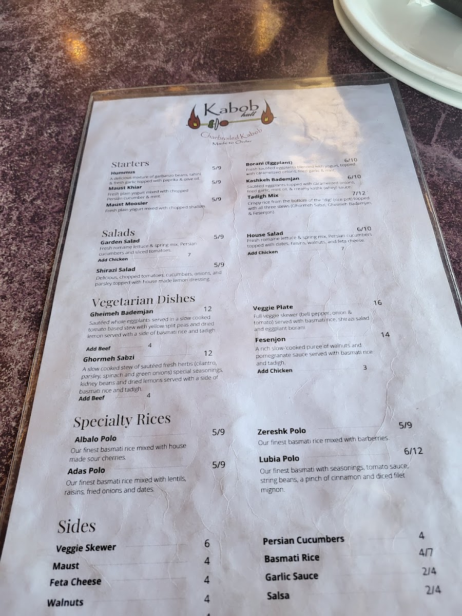 Vegetarians will not be disappointed either, with options like Gheimeh Bademjan—a hearty stew of eggplants and yellow split peas served with fragrant basmati rice for just $12. Kabob Hutt's specialty rice dishes, such as Albalo Polo mixed with house-made sour cherries, are the perfect accompaniment to any meal.