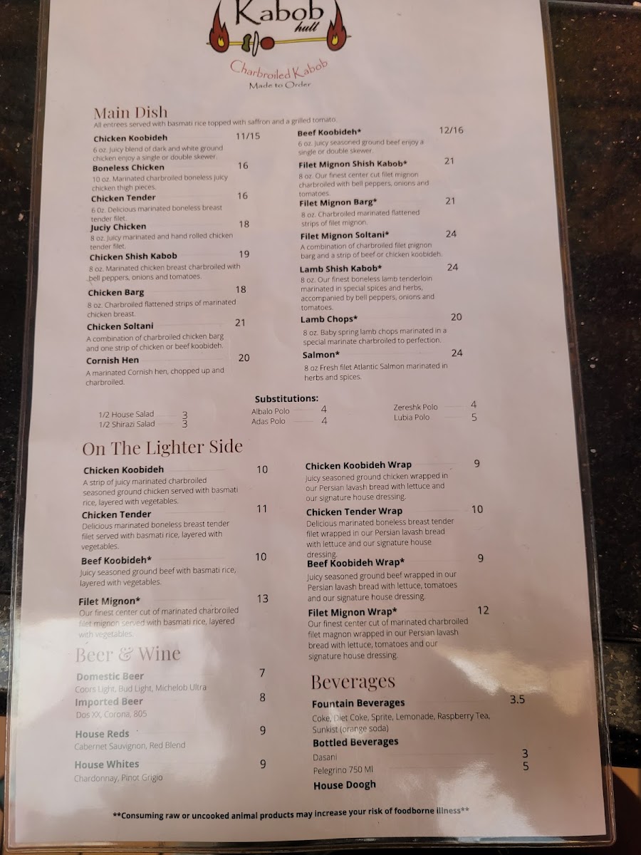 Welcome to Kabob Hutt, a delightful Mediterranean restaurant located at 165 Washburn Cir, Corona, CA. This hidden gem is renowned for its exquisite offerings that celebrate bold flavors and fresh ingredients. The menu features a range of succulent dishes, including the Lamb Shish Kabob—tender lamb tenderloin marinated in special spices and grilled with bell peppers and onions, priced at $24. For seafood lovers, the Salmon Main offers fresh Atlantic salmon, expertly marinated and cooked to perfection.